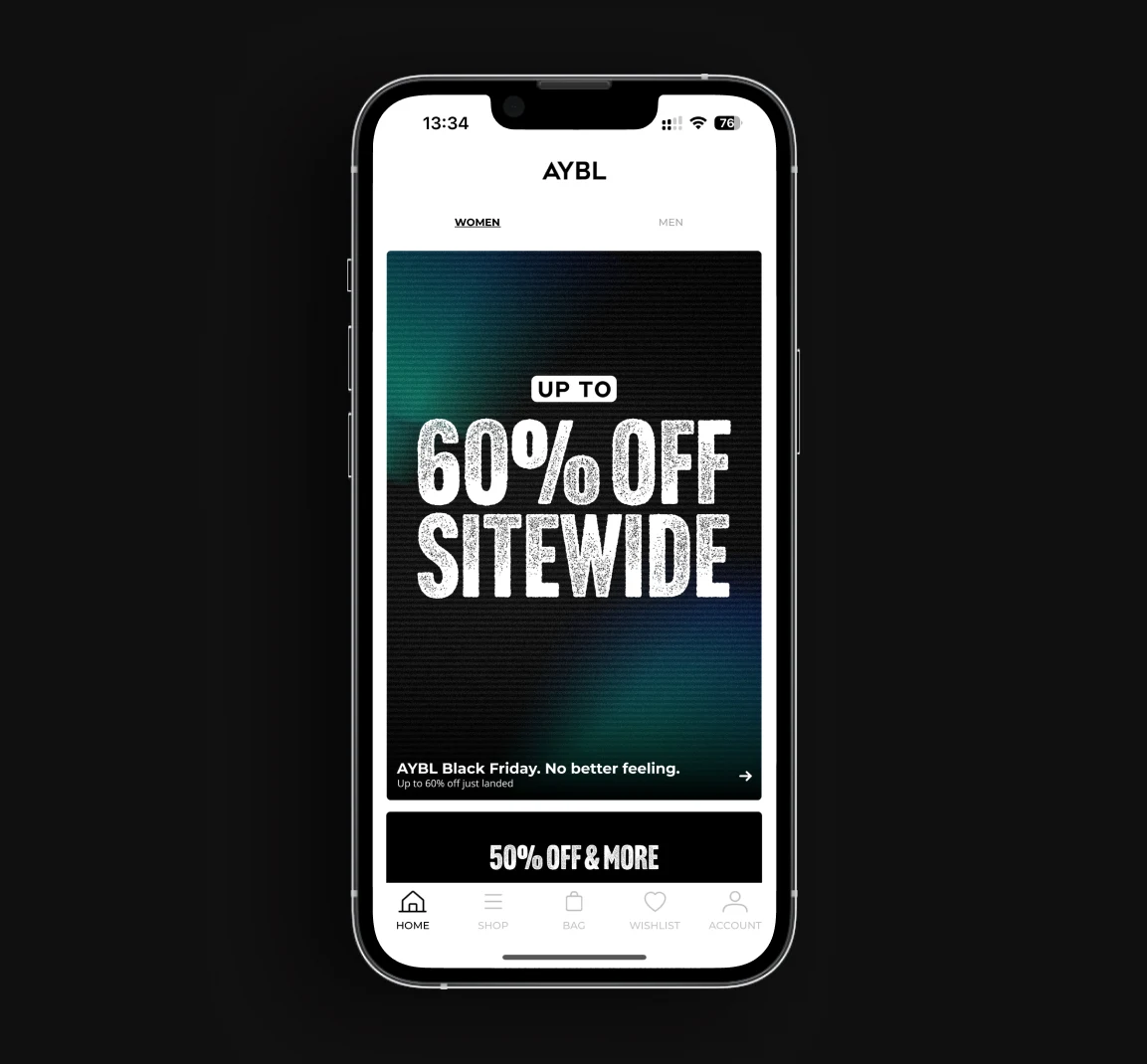 Ahead of their big BFCM sale, AYBL locked both their app and website using the Venn Lock Screen. Customers were told that the app would open first and that they’d need to download it and opt in to push if they wanted to be notified the moment the sale went live.