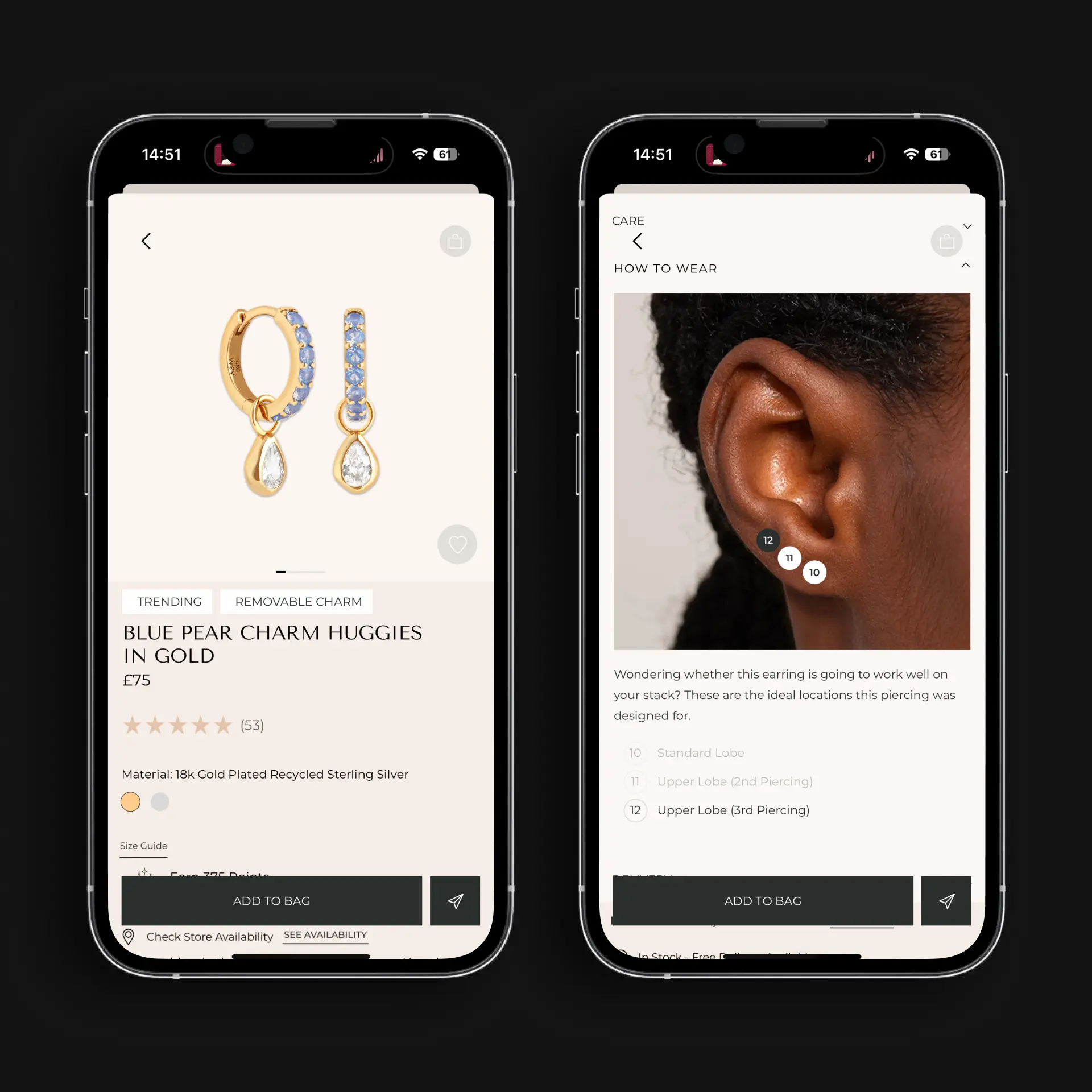 Each product page includes everything customers look for before they buy: reviews, material details, loyalty information, in-store availability and care guides. The “how to wear” section adds another layer of value, showing ideal piercing placements and styling inspiration that helps shoppers visualise complete looks.